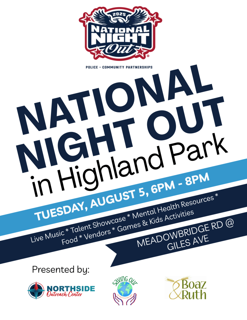 Join your neighbors for an evening of fun and community! National Night Out takes place on August 5, from 6-8pm on Giles Ave (between the NOC/Boaz & Ruth – right off Meadowbridge)